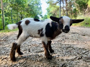 Nigerian Dwarf goats are smaller (does should stand no taller than 22.5 inches and bucks 23.5 inches) and come in a variety of colors. There is no weight standard but they generally average about 75 pounds. They are the perfect addition to any farm or backyard. These adorable and friendly creatures are small in size, but big on personality. Not only are they great for milk (with a high percentage of butterfat/cream) and meat production, but they also make fantastic pets. With their playful and affectionate nature, Nigerian Dwarf goats are sure to bring joy and entertainment to any household. They also make a great project for a 4H or FFA member. Don't miss out on the opportunity to add these delightful goats to your life.